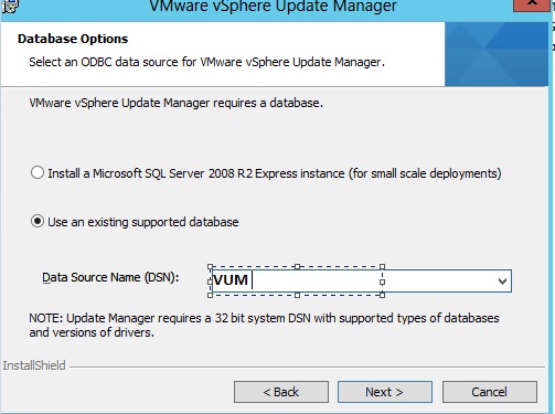 Although you can install the Update Manager server only on 64-bit machines, Update Manager is a 32-bit application and requires a 32-bit DSN.
