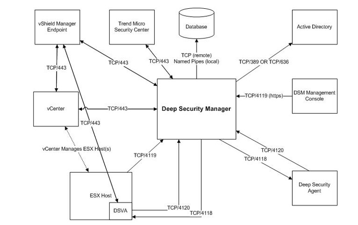 The Deep Security Manager coordinates the protection being provided to each guest virtual machine. This is done through the Deep Security Virtual Appliance which uses the VMware Endpoint API to apply the protection to the virtual machines. The Deep Security Filter driver controls network traffic in and out of the guest virtual machines.
