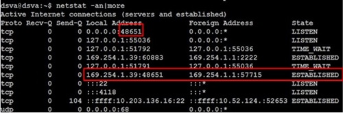 The 48651 port of the Antimalware process should display “LISTEN” whereas the connection between 169.254.1.39 and 169.254.1.1 should display “ESTABLISHED”.