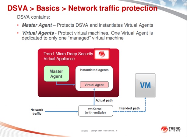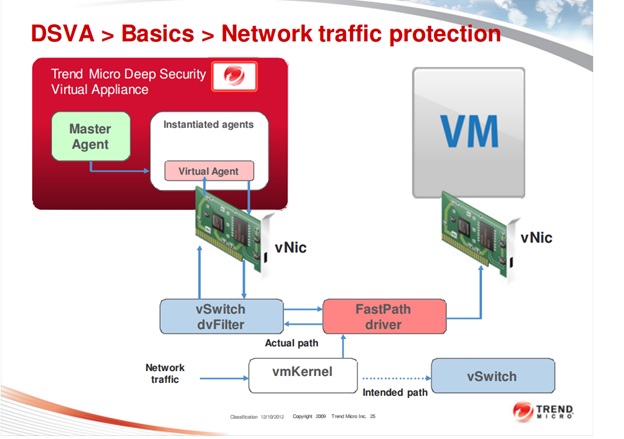 Agentless protection will use two different transport layers, EPSec ( vSheild EndPoint) driver is provided by VMware and it creates the EPSec transport and VMsafe-Net modules will create the traffic between the vSwitch portgroup and the VM’s virtual NIC.Network traffic to be inspected is routed through the VMsafe-Net Transport to the DSVA, which is registered with the VMsafe-Net driver provided by Trend Micro. While VMsafe-Net can operate on all packets passed through the VMsafe-Net components, EPSec only operates on that traffic sent to it via the EPSec Driver within the VM. This driver is required as file open and changes must be sent through the EPSec path to the DSVA. Not all file/block traffic is sent through the EPSec paths to the per-vSphere host DSVA. On file open the file blocks are sent, and from then on only the changed blocks.