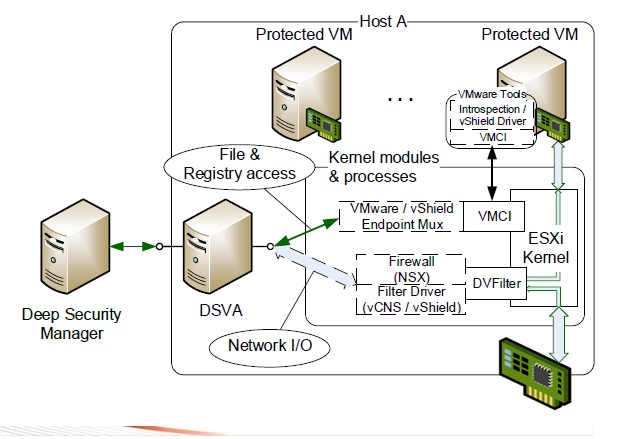 The vShield / VMWare Endpoint framework includes the vShield (v.5.x), VMware Endpoint (v.6.0) or Guest Introspection (v.6.1) service installed on the Host and the vShield / Guest Introspection Drivers installed on protected VMs. Deep Security uses this solution to implement the Anti-Malware scanning, Integrity Monitoring and Recommendation Scans on DSVA.
