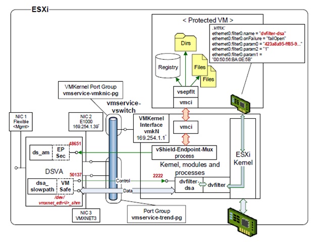 Also when DSVA is down anti-malware and integrity monitoring functionality will not work.As far as the Firewall and IPS is concerned, the network traffic of the NICs goes through the VMware dvfilter Kernel Module installed as a part of the “Prepare ESX” operation.