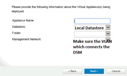 Pls make sure to select the local datastore and also the Vlan which connects the DSM