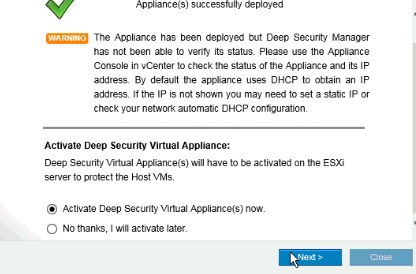 DNS Resolution : Ensure that the DSVA can resolve the FQDN of the Deep Security Manager and that the ESX server is able to connect to the DSM FQDN at port 4119. There will be issues installing the driver and deploying DSVA if ESX cannot do so.Ensure that the DSM and vShield Manager FQDN can be resolved by DSVA.