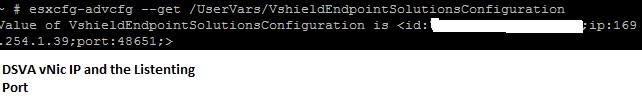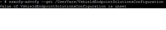 Try “esxcfg-advcfg –get /UserVars/VshieldEndpointSolutionsConfiguration” command