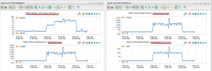 Trend Micro Deep Security with VMware vCenter Operations Manager v5.8.x (Advanced edition) enables organizations to compare security event activity with performance activity. For example (image 2), we are looking at SQL server (top left) activity. We can see that at the CPU Demand is at 30 percent and then increases sharply to 88 percent. The security event metrics (bottom left) show that the number of security events has also gone up. The detailed information for the security activity (right) shows that these events were due to firewall and malware events being triggered. The jump in security activity and possible threats is likely impacting the performance and causing the spike. The operations team can now inform the security team of their findings and the machines with security events can be examined in detail.