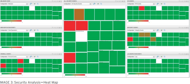 The Deep Security Heat Map (image 3) quickly lets you see which computers are under attack the most at any given time. Like other vCenter Operations Heat Maps, green indicates fewer events occurring on a particular computer while red indicates more security events triggered. These events can be any of the events in Deep Security Manager; Anti-Malware, Intrusion Prevention, Integrity Monitoring, Firewall, and Web Reputation.