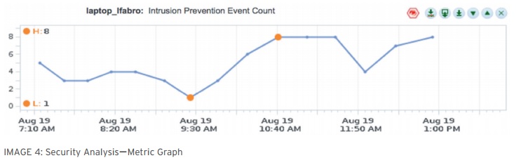 Clicking on the Heat Map will give you the Metric Graph (image 4) for that particular machine. Operations teams can see individual graphs for each type of security event: Anti-Malware, Intrusion Prevention, Integrity Monitoring, Firewall, and Web Reputation. These graphs share critical information such as total events over time and highest/ lowest event counts. This enables a quick overview of the peak time events are being triggered, as well as the specific security events being triggered.
