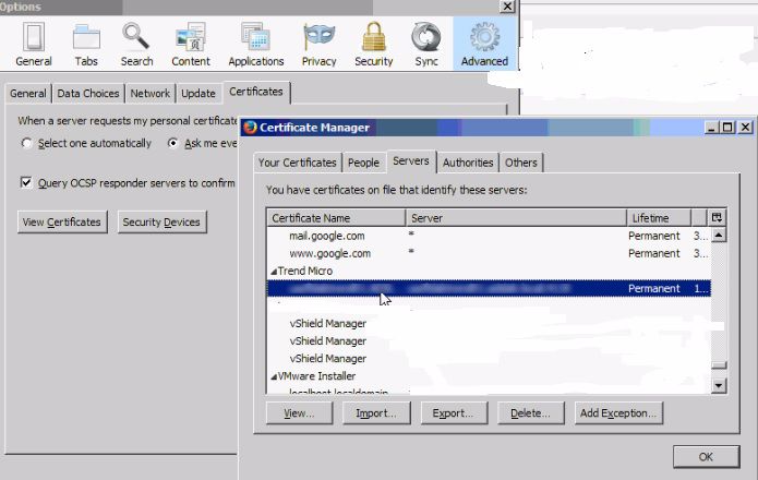 Export the Deep Security Manager Certificate from the Firefox – Options – Advanced – Certificate – Certificate Manager – Servers tab – Export – Select X.509 format – Save the certificate to a file.