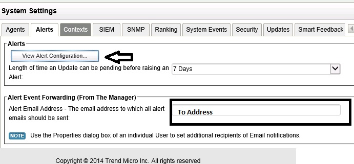 We can also use Deep Security Manager to configure an SMTP server to send email if any alert occurs. This can be found under the Web Console >> Administration >> System Settings >> Alerts and SMTP tab.