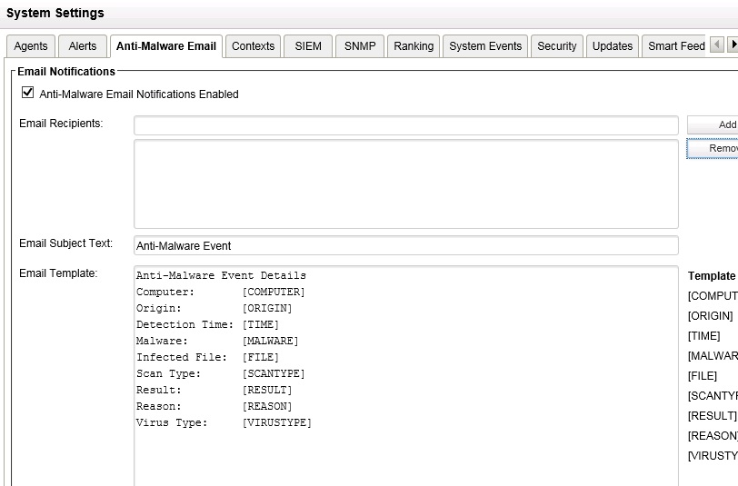 The “Anti-Malware Email” Tab to configure the notification recipients can be found under Administration >> System Settings.