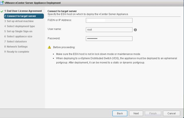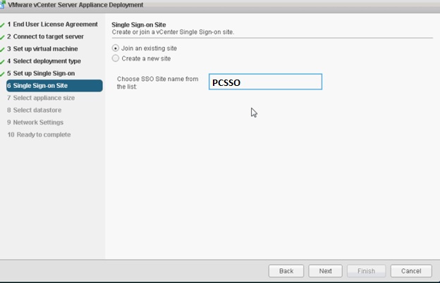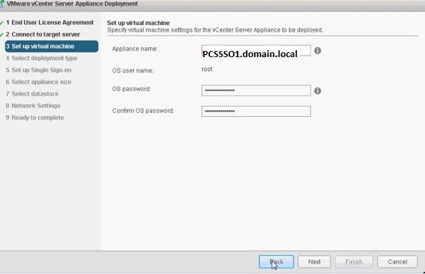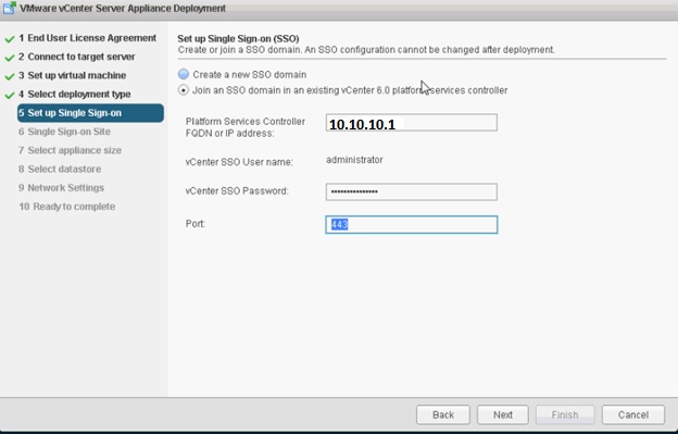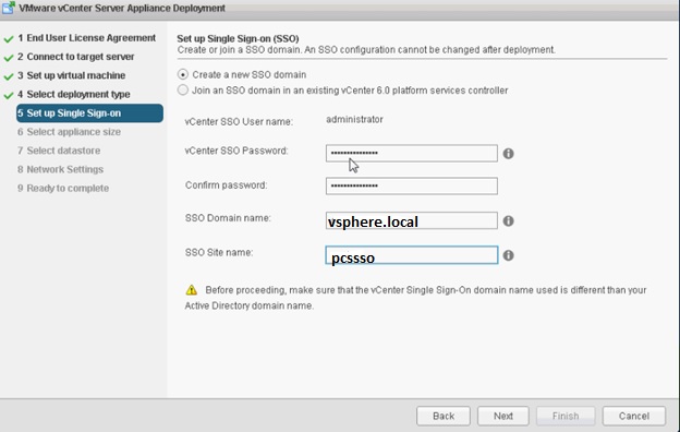 Select Create a new SSO Domain and enter an administrator vCenter SSO Password; enter an SSO Domain name such as vsphere.local and an SSO Site name such as a city or physical location name