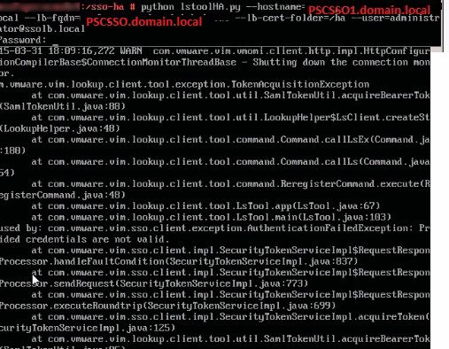 where FQDNofLocalMachine is the FQDN of the machine where the script is being run, loadbalancerFQDN is the FQDN of the load balancer’s VIP used for load balancing the Platform Services Controllers, SSODomain is the vCenter Single Sign-On domain (by default vsphere.local), and password is the password for the vCenter Single Sign-On administrator. The password parameter is optional; if not specified, you will be prompted for it.