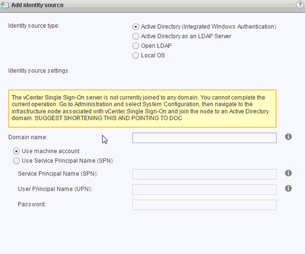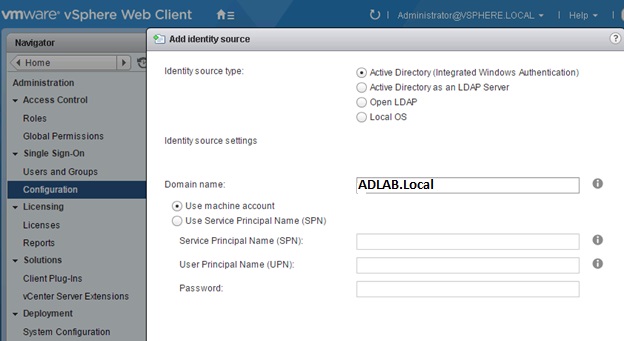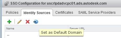 After the AD configuration is completed in PSC , Go to the Single Sign-On – Configuration – Identity Sources.