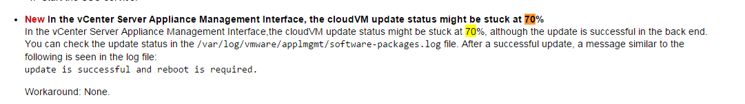 When we are installing the vCenter update using the web-client ( https://VCFQDN:5480 ) it got stuck at 70%.