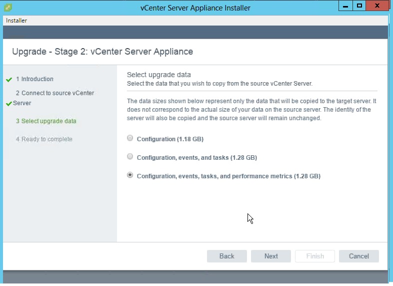 Next it will show the data size to be copied to the new target server and the size will be depends on our environment.Also we can decide what data we need to copy to the new upgrade target VM.