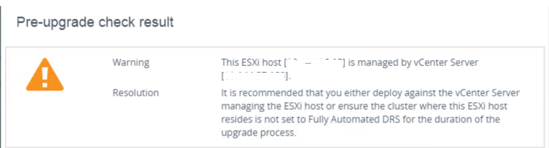 On the second phase it will show the below warning to make sure the appliance is not under fully automated DRS to avoid vmotion of the VM to the other host.