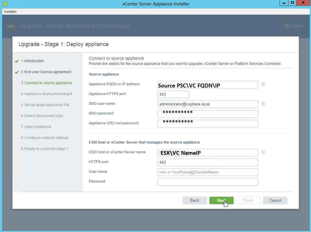 Next provide the source PSC\VC IP and also select the ESX\VC which the source appliance is running.