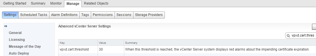 - Change the setting of vpxd.cert.threshold to the desired value and click OK.