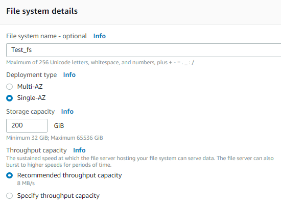 | Price | $0.14 GB-month / 30 / 24 = $0.000194/GB-hour 3600 GB x $0.000194/GB-hour x 72 hours = $50.40 Total FSx for Lustre charge for 72 hours = $50.40 | Storage: 1,024 GB-months x $0.130 GB-month= $133/mo Throughput: 8 MBPS-months x $2.200/MBps-month= $18/mo Backup: 500 GB-months x $0.050/GB-month = $25/mo Total monthly charge: $176 ($0.172/GB-mo) |