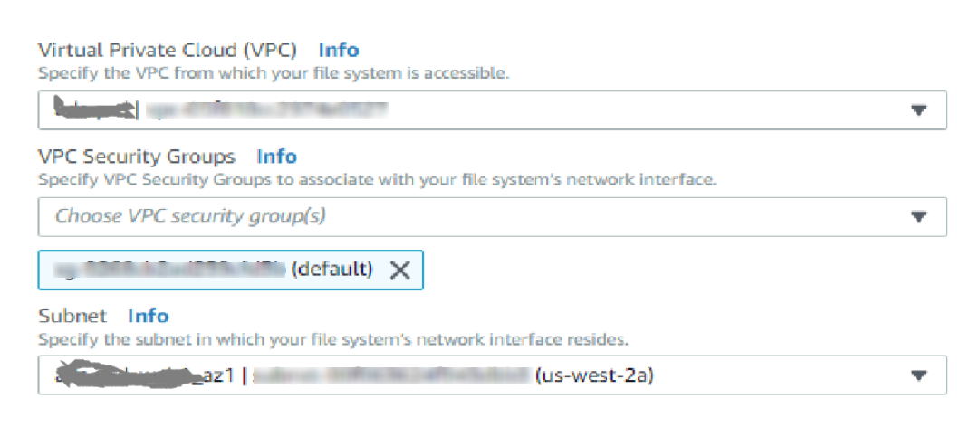 Network & Security – Select your VPC; Availability zone; Subnet; VPC Security Group