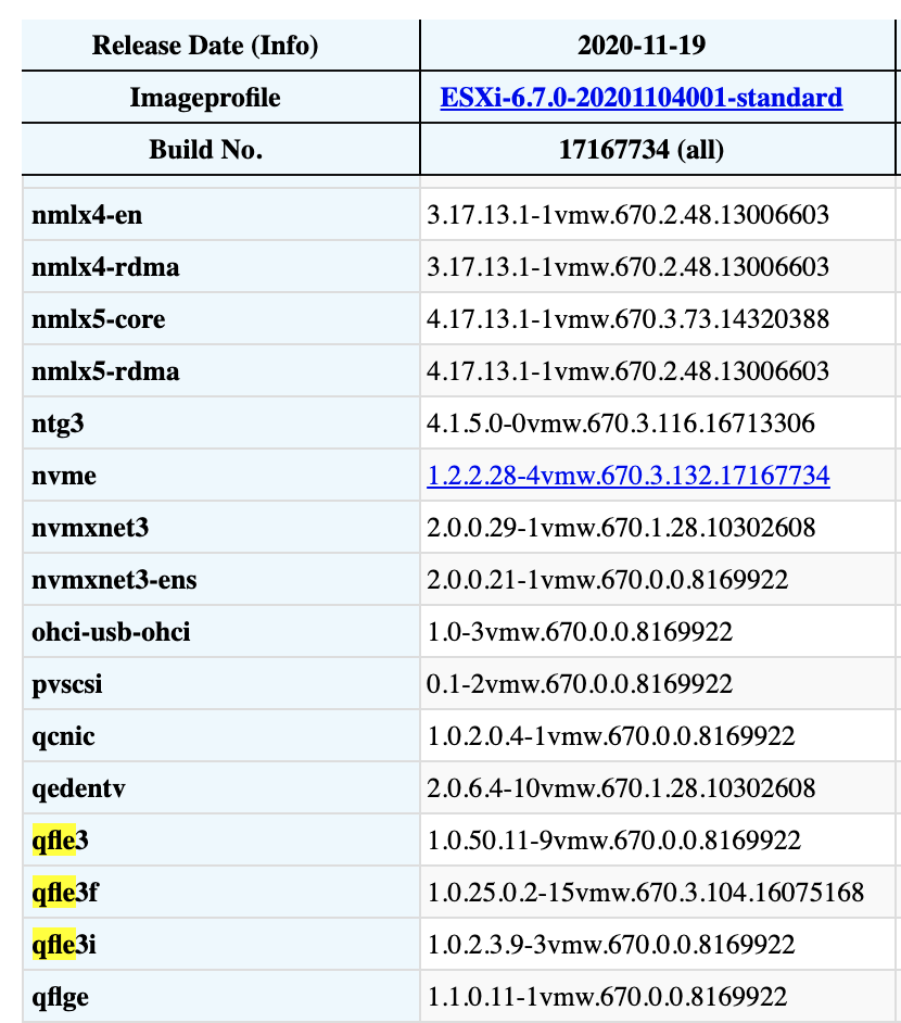 Version which comes with the HP custom image includes the qfle3 driver version 1.1.6.0-1OEM.650.0.0.4598673 and We have tried updating the driver \ firmware of the HP Enclosure \ OA \ Virtual Connect to the below versions but didn’t fix the issue.