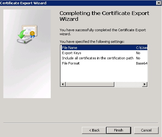 Click Next and Finish to save the certificate file.