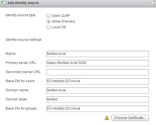 Enter the required information in the Add Identity Source wizard. When completed, click Choose Certificate and browse to the location of the Certificate you saved previously.