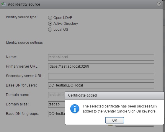 You receive a confirmation message when you have imported the certificate successfully. Click OK to close the dialog and OK again to finalize adding the new identity source.